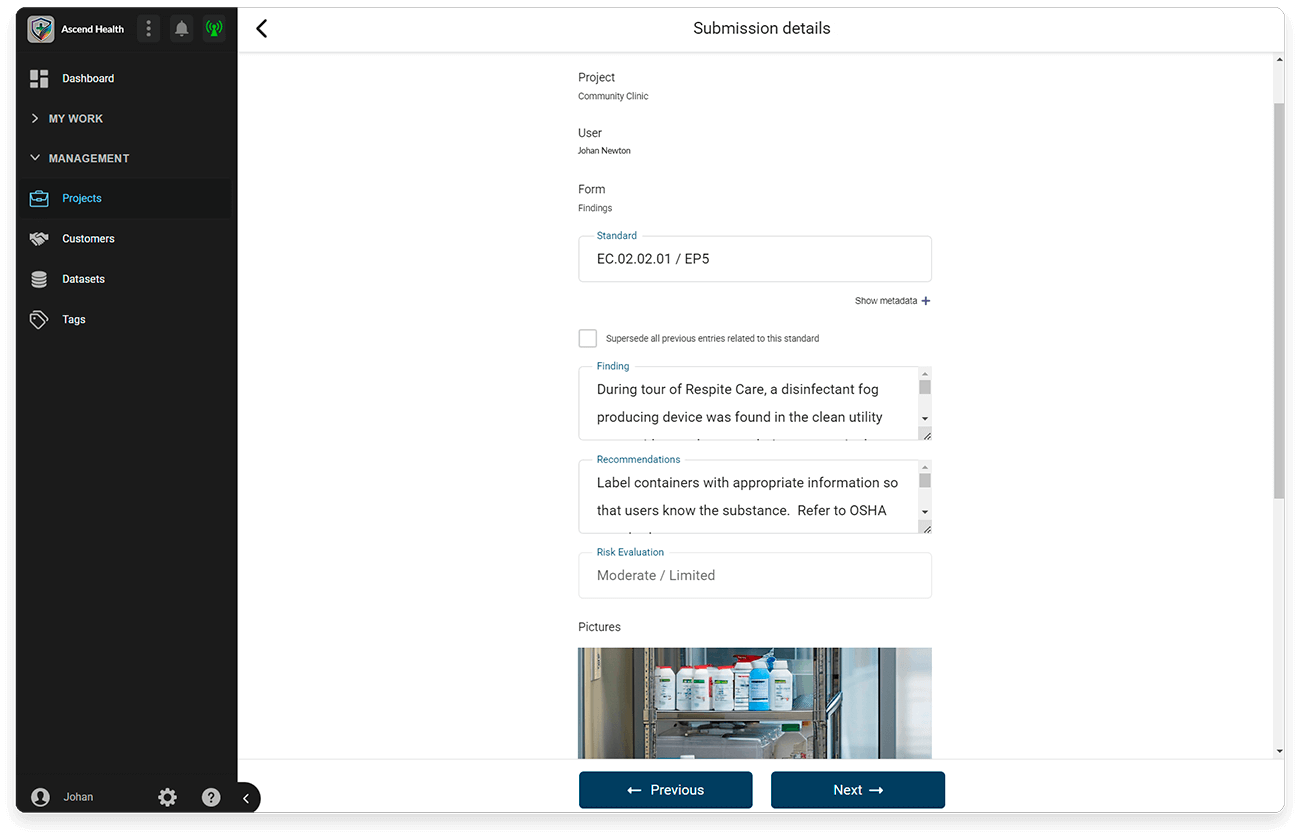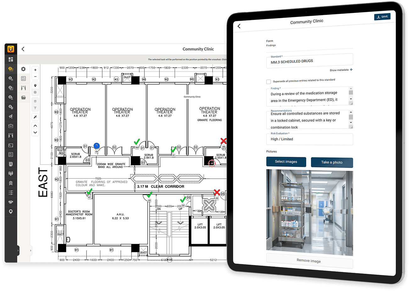 The surveyor gathers findings during their walkthrough of the facility using easy-to-use forms. They can record findings as text, photos, or voice annotations.